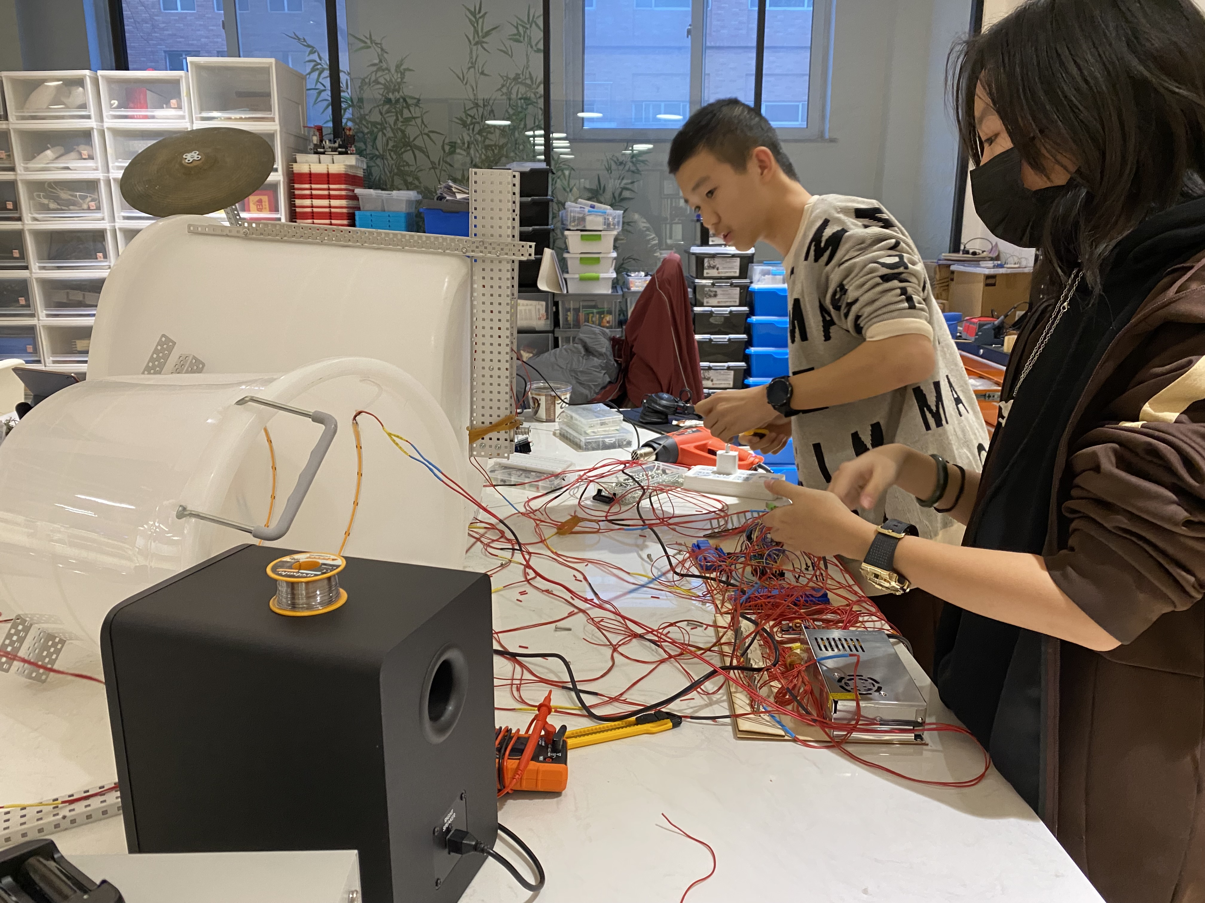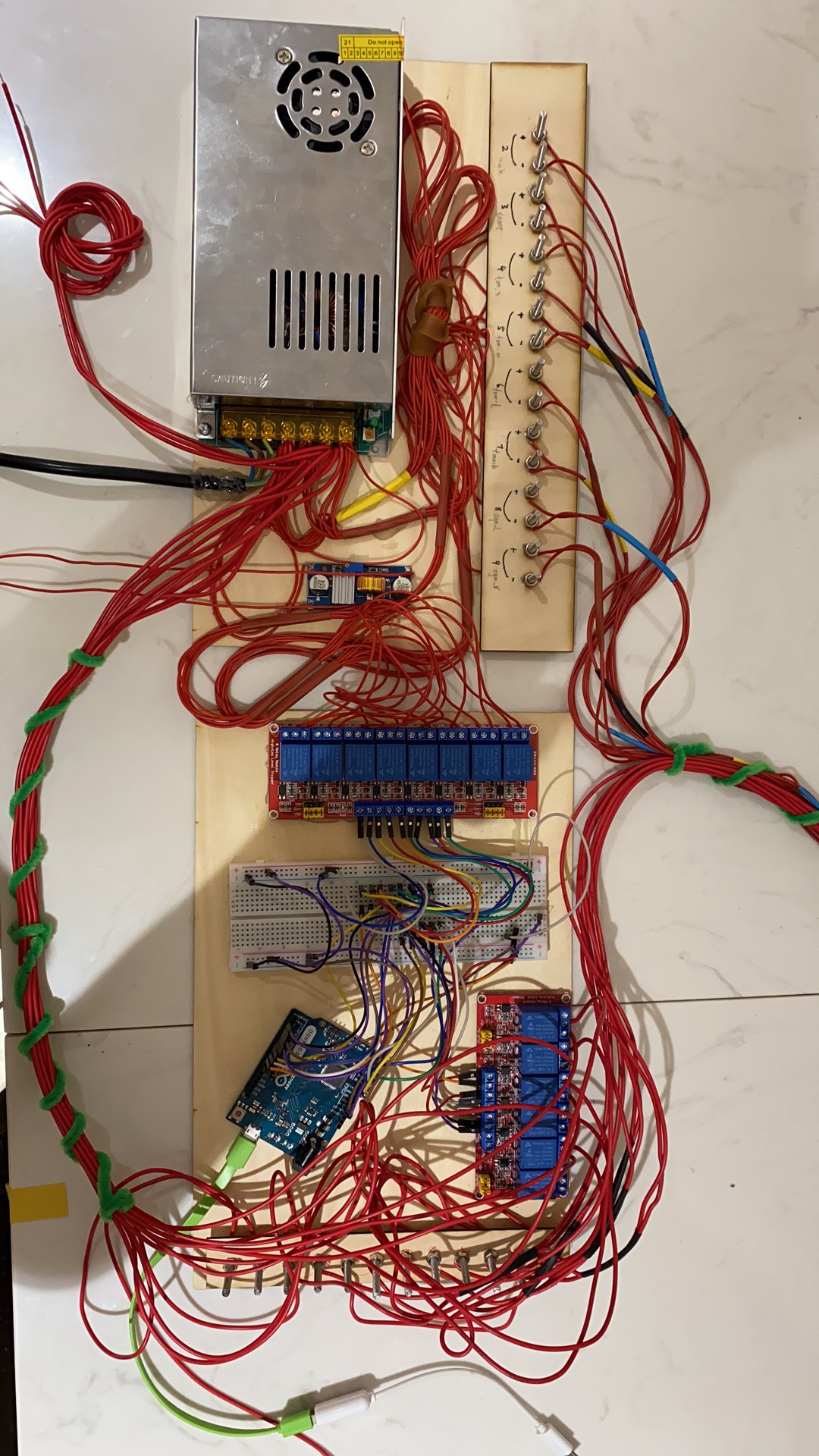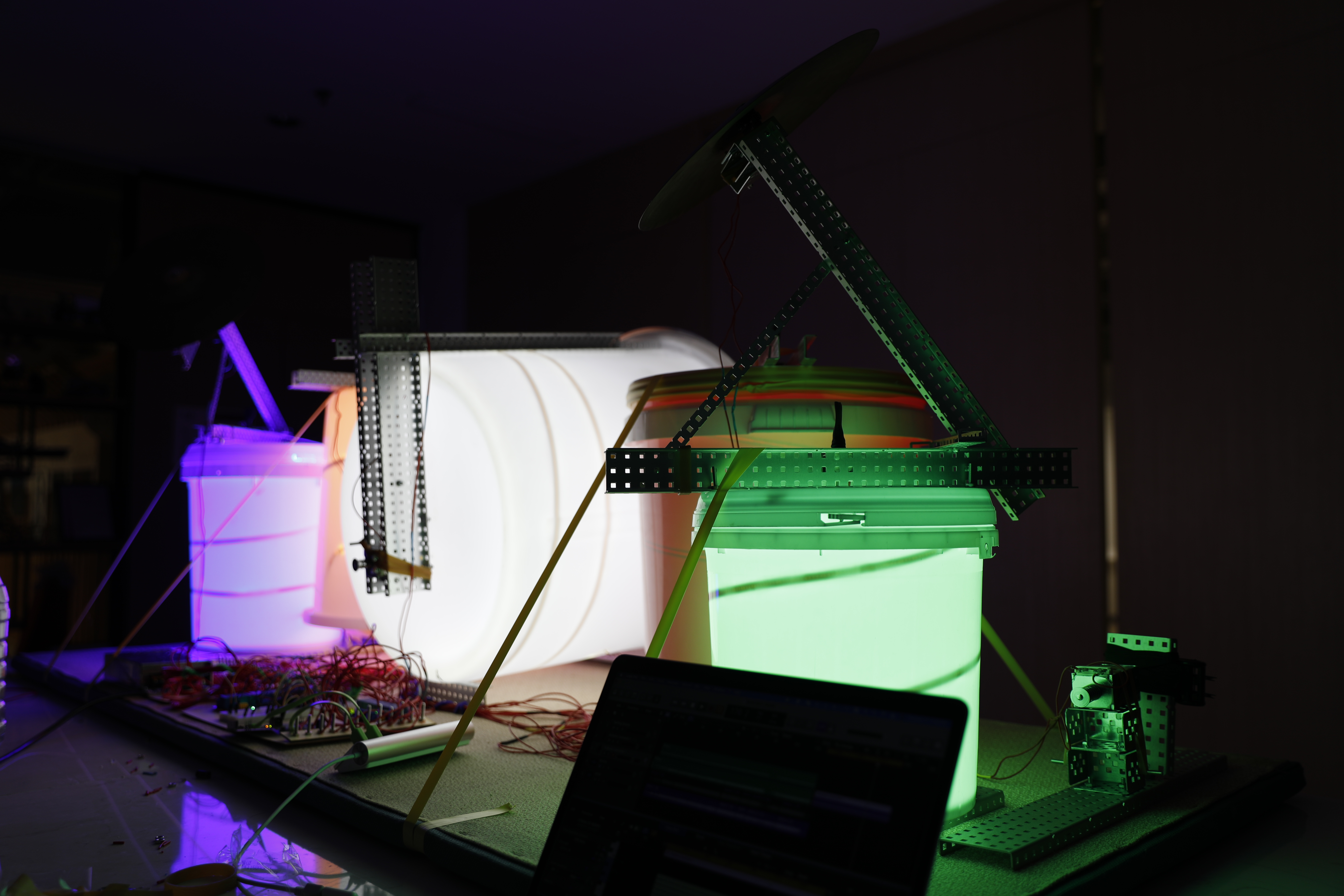 It featured 8 relay-driven solenoids operated by an arduino leonardo. 8 LED strips were located inside the bucket and can be independently controled through MIDI signals. The latency is about 100ms, which was good enough for our purposes. The robot performed live 3 times at various highschool events.