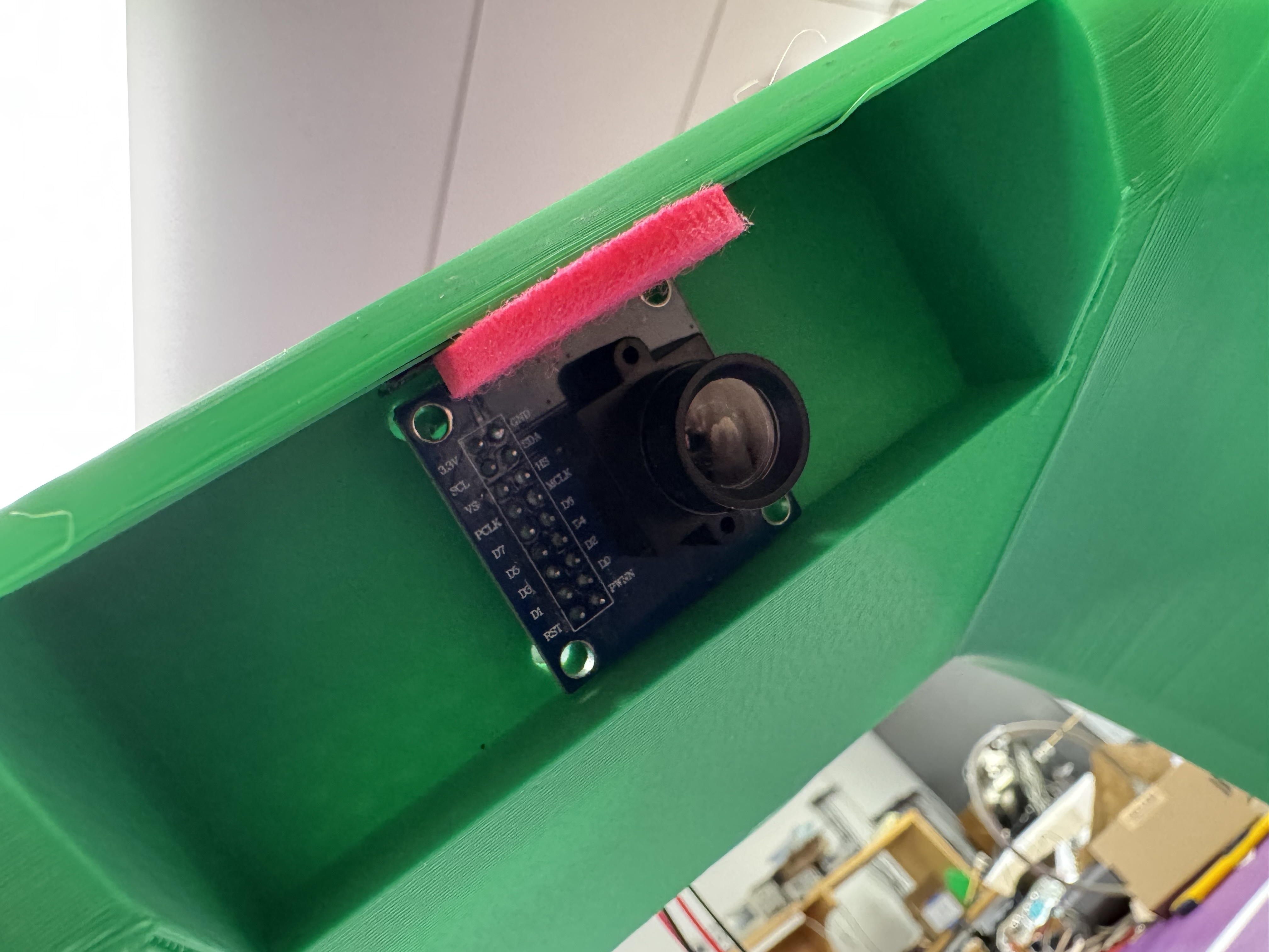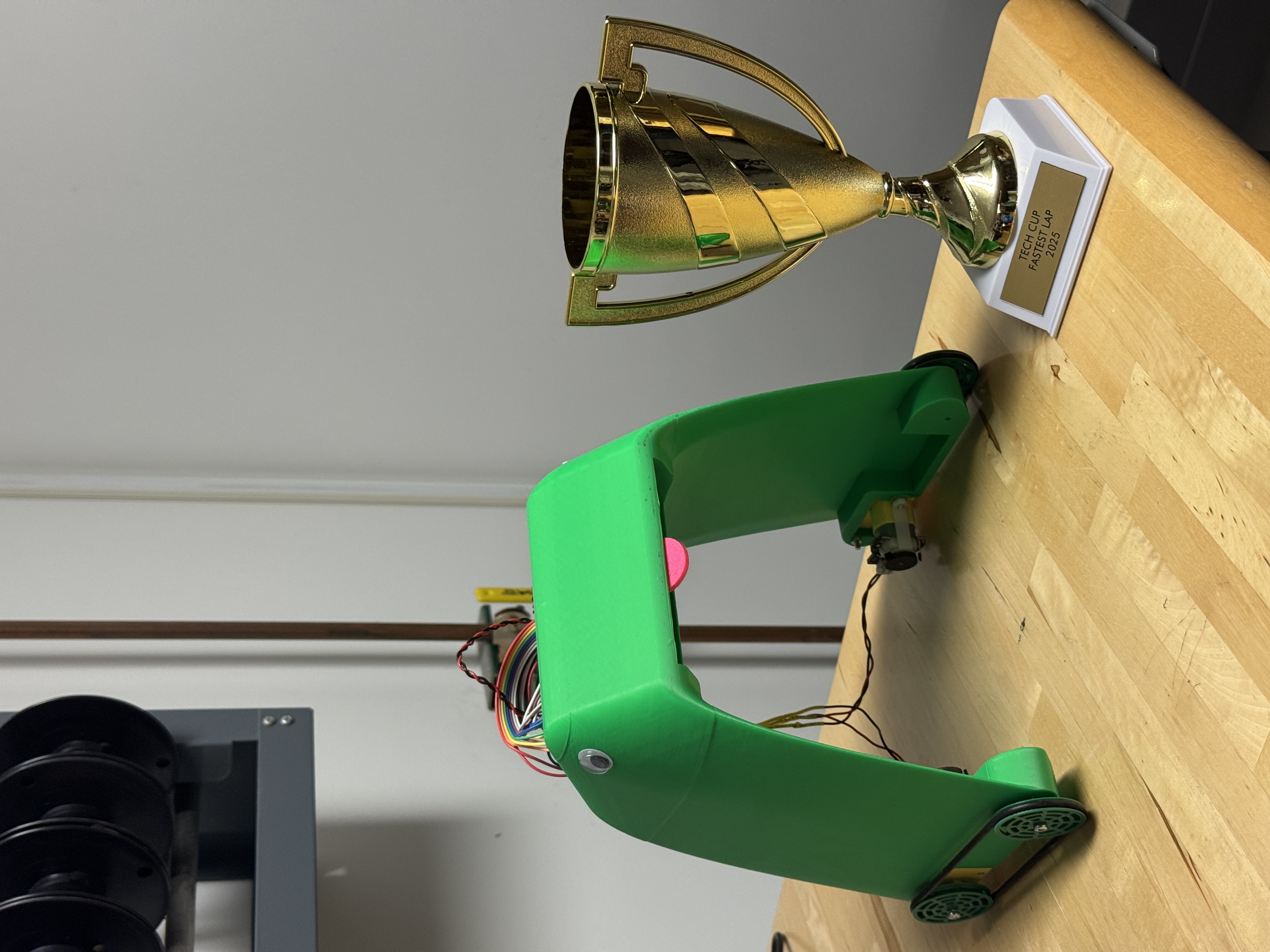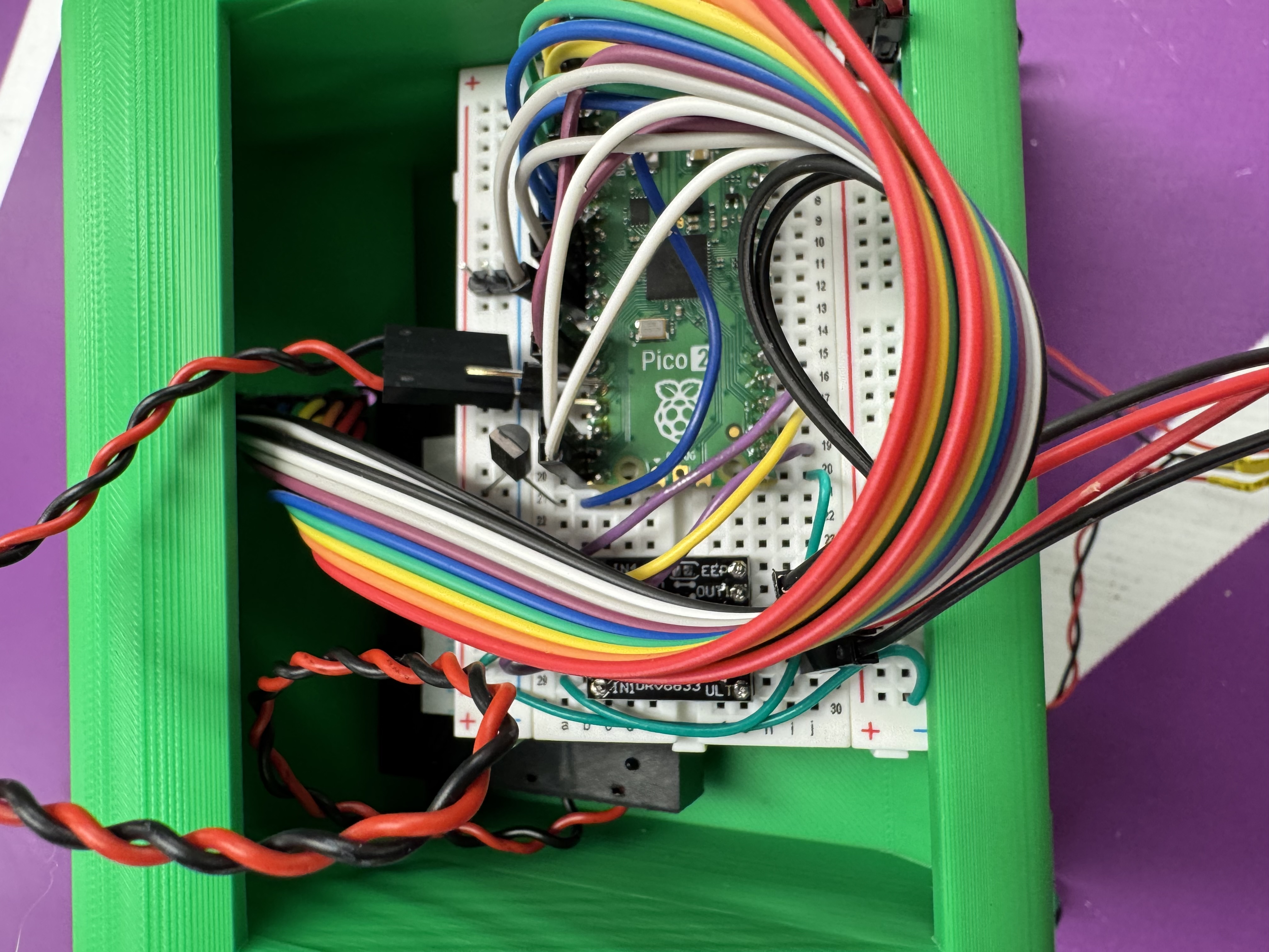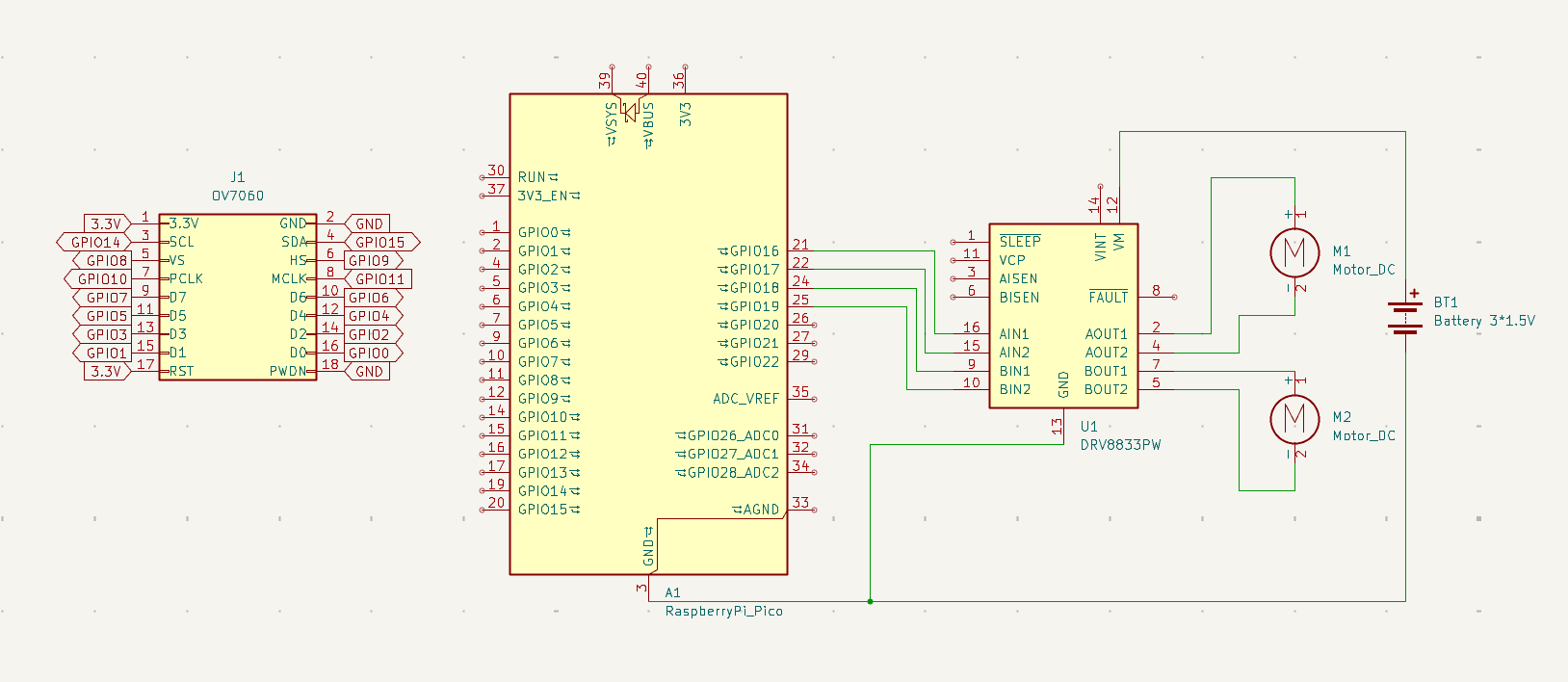 KERMIT is powered by dual belt-driven DC motors, controlled by a Raspberry Pi Pico running firmware written in the C SDK. A simple PID controller is used to maintain a constant distance from the line, while a camera mounted on the front of the robot captures the horizontal position of the line and sends it to the Pico over I2C.