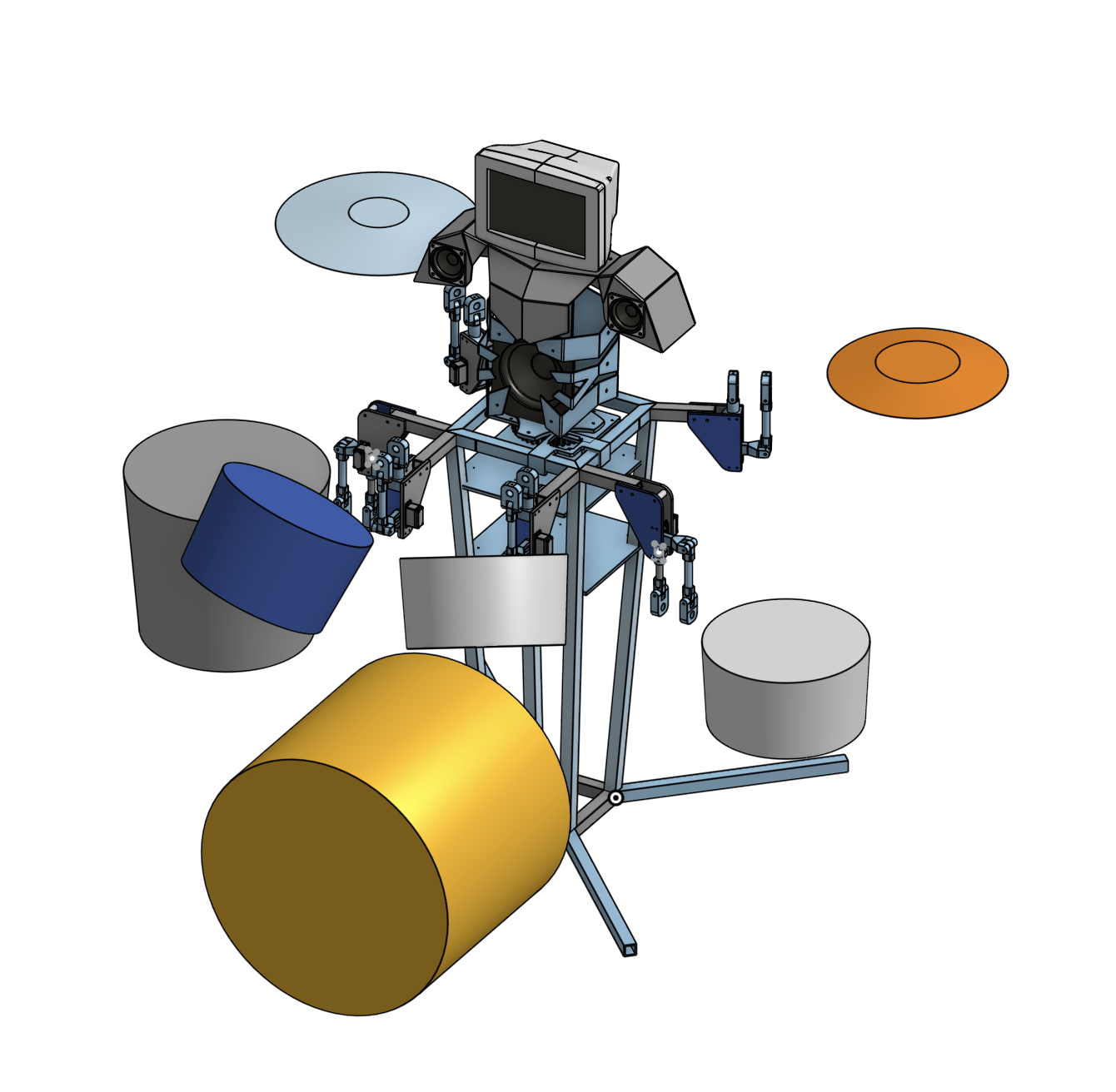 The robot has a welded stainless steel base, 7 servo-actuated arms, 2 solenoid actuated kicks, 3 stepper motors, 3 speakers, and an LCD screen face, all coordinated by a microcontroller and raspberry pi communicating through I2C.